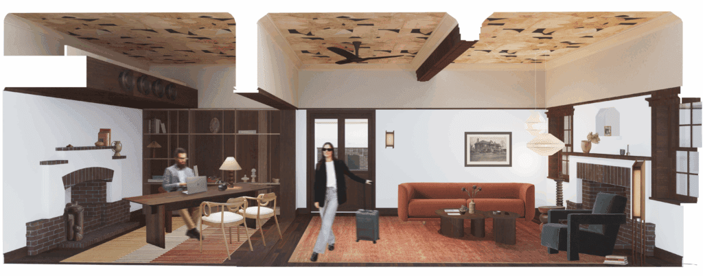 The building was designed in the inter-war old English architectural style, with evidence of both the inter-war art deco style and the arts and craft style in its overall form and detailing. The interior of the Hotel features relatively intact arts and craft detailing in both the public areas, including the reception and adjacent lounge and former dining room. (Examples of the reception room fireplace Arts and Craft designs that have informed the project vision are pictured below).